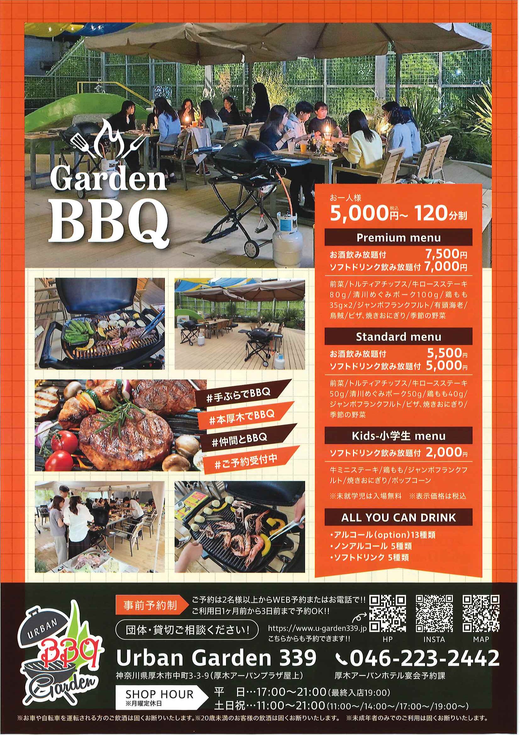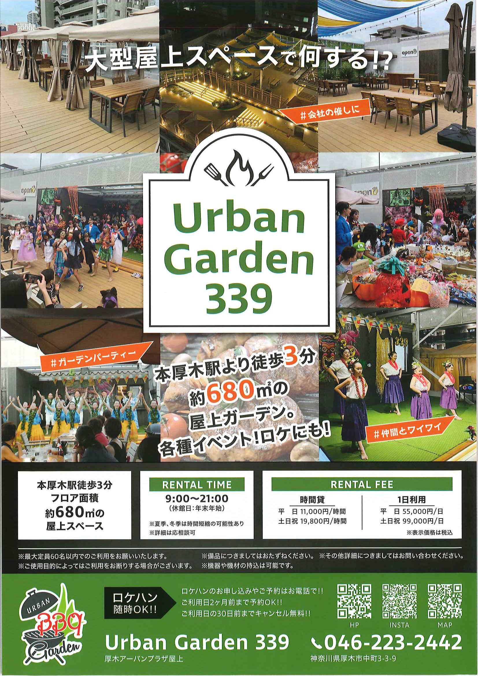 今回は、本厚木駅徒歩3分のルーフトップBBQガーデン「Urban Garden 339」さんからのお知らせですよ~!