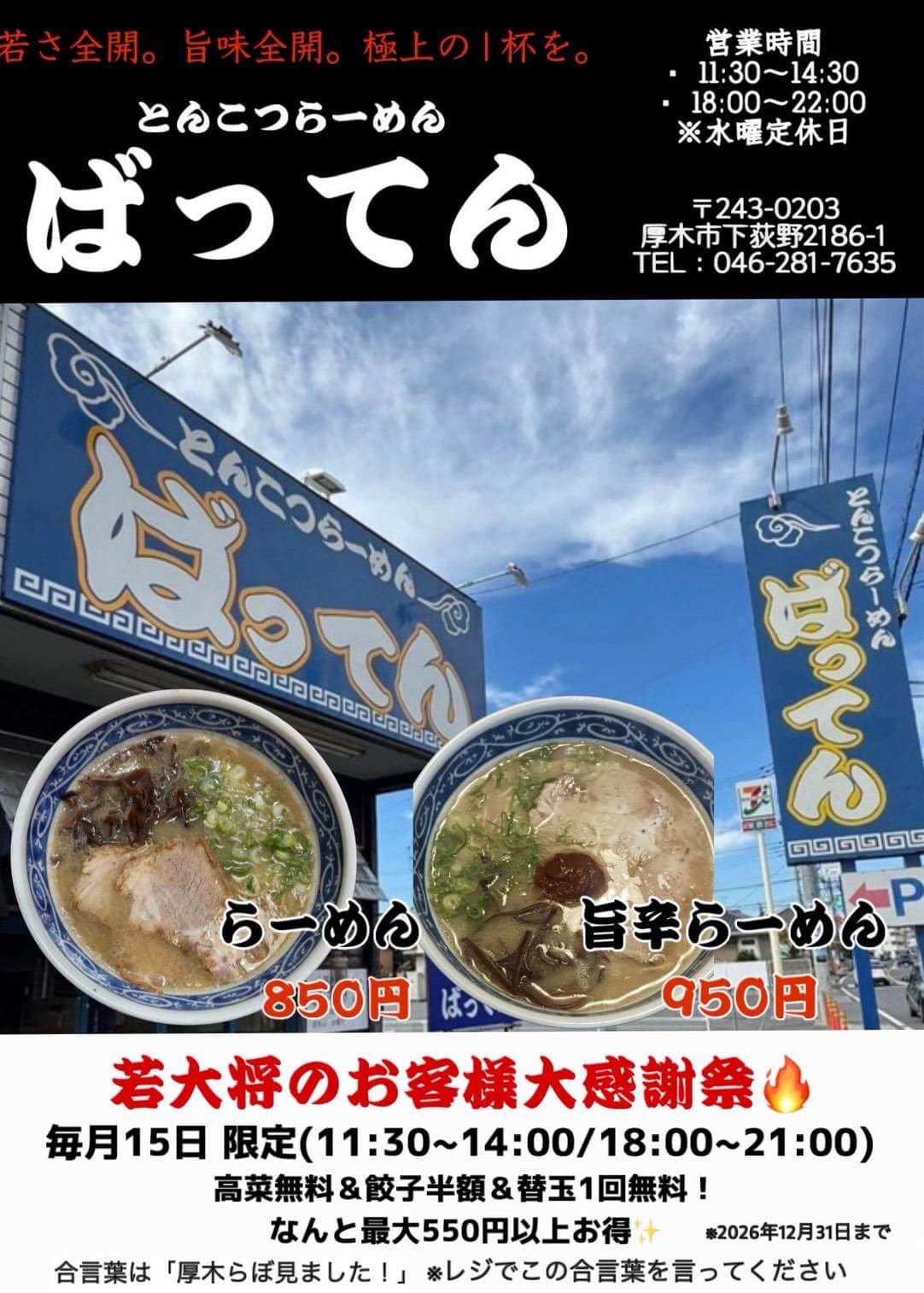 【厚木らぼ特典あり】下荻野「とんこつらーめん ばってん」がリニューアルオープン★最大550円以上お得なお客様大感謝祭を開催!