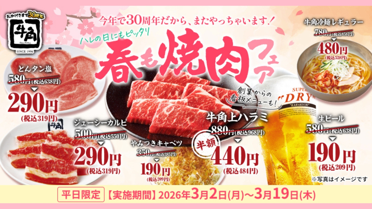 牛角「春も焼肉フェア」人気メニュー15品以上を何皿・何杯でも特別価格で提供!