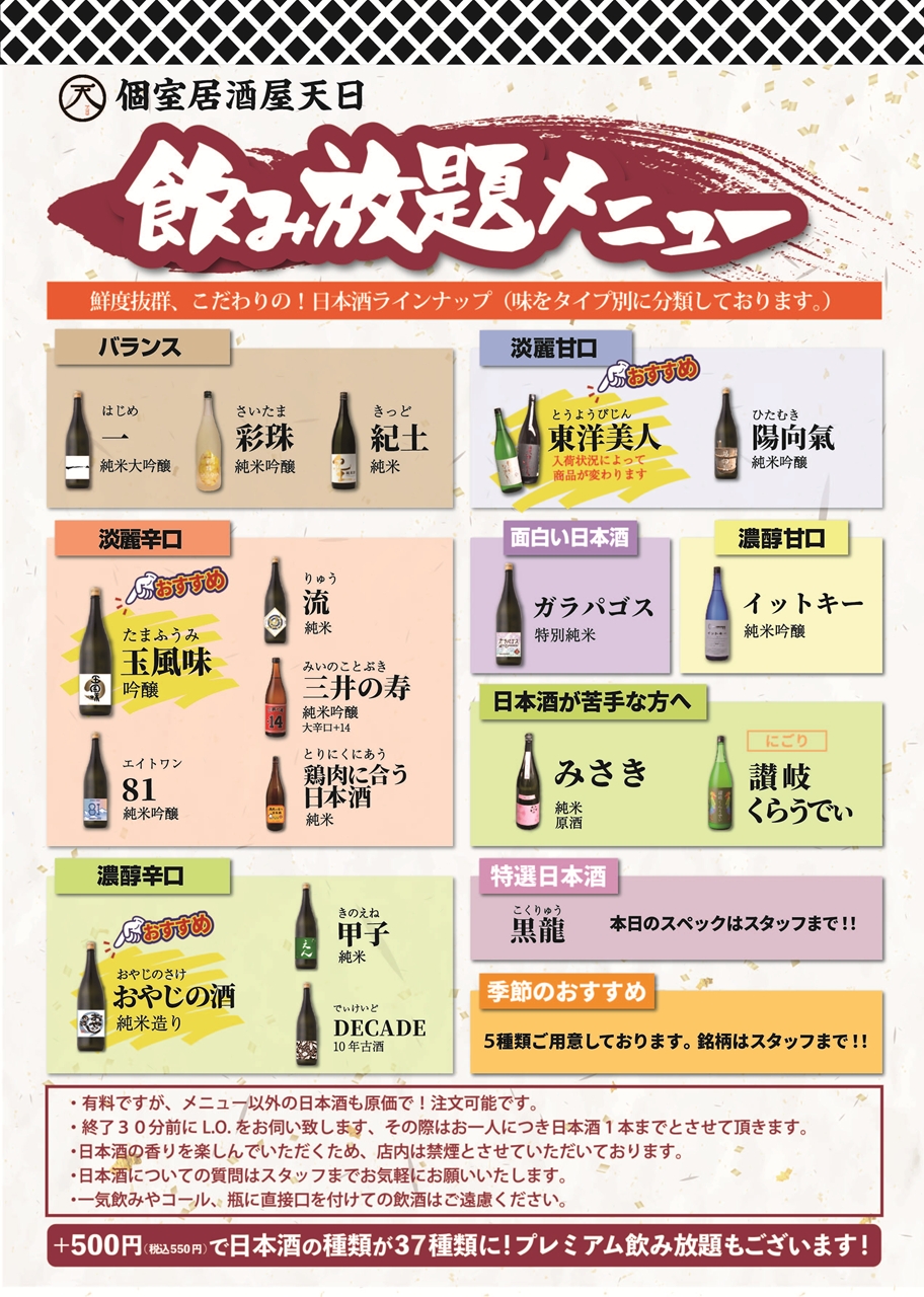 ・お1人様+550円(税込)で日本酒が37種になるプレミアム飲み放題への変更も可能です。