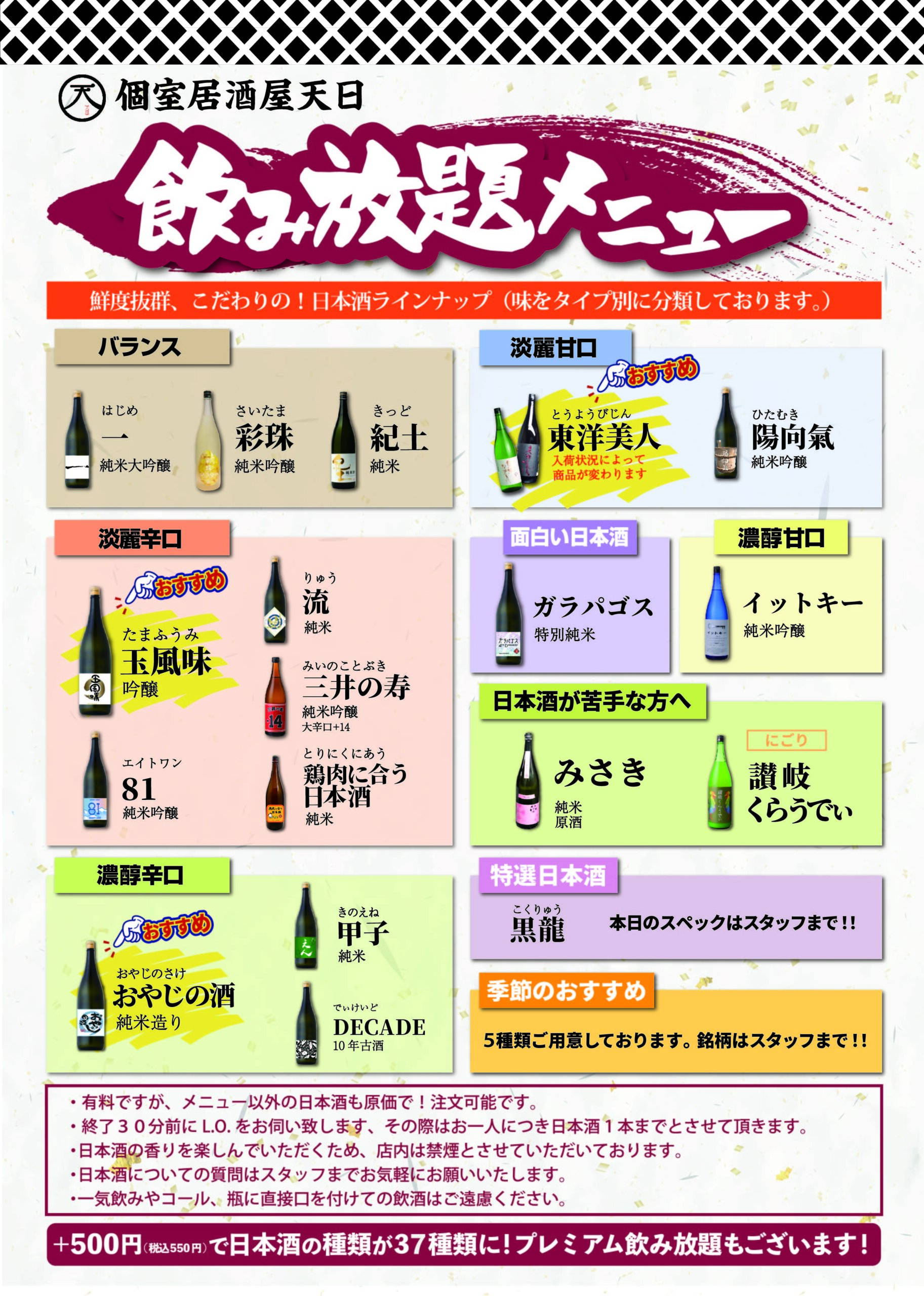 ・お1人様+550円(税込)で日本酒が37種になるプレミアム飲み放題への変更も可能です。