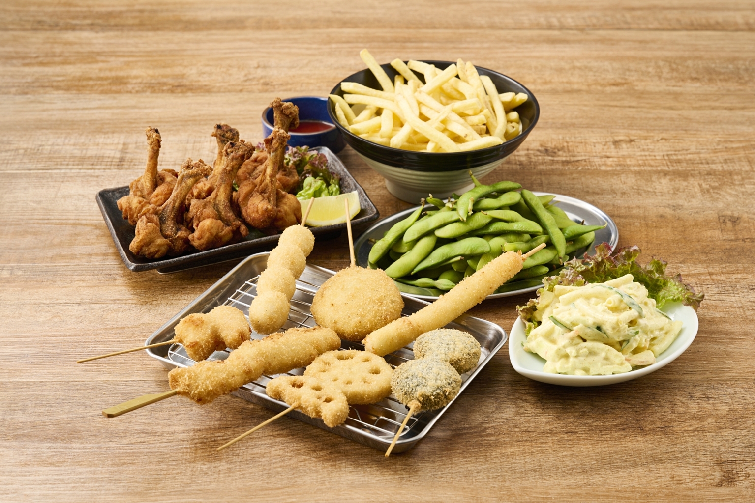 一品メニュー4種(ポテトフライ・マカロニサラダカレー風味・チューリップから揚げ5個・枝豆)の計11種が、
