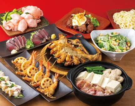 炭焼きカツオのたたき、若どりの水炊き鍋、串揚げ2種盛りなど全9品。