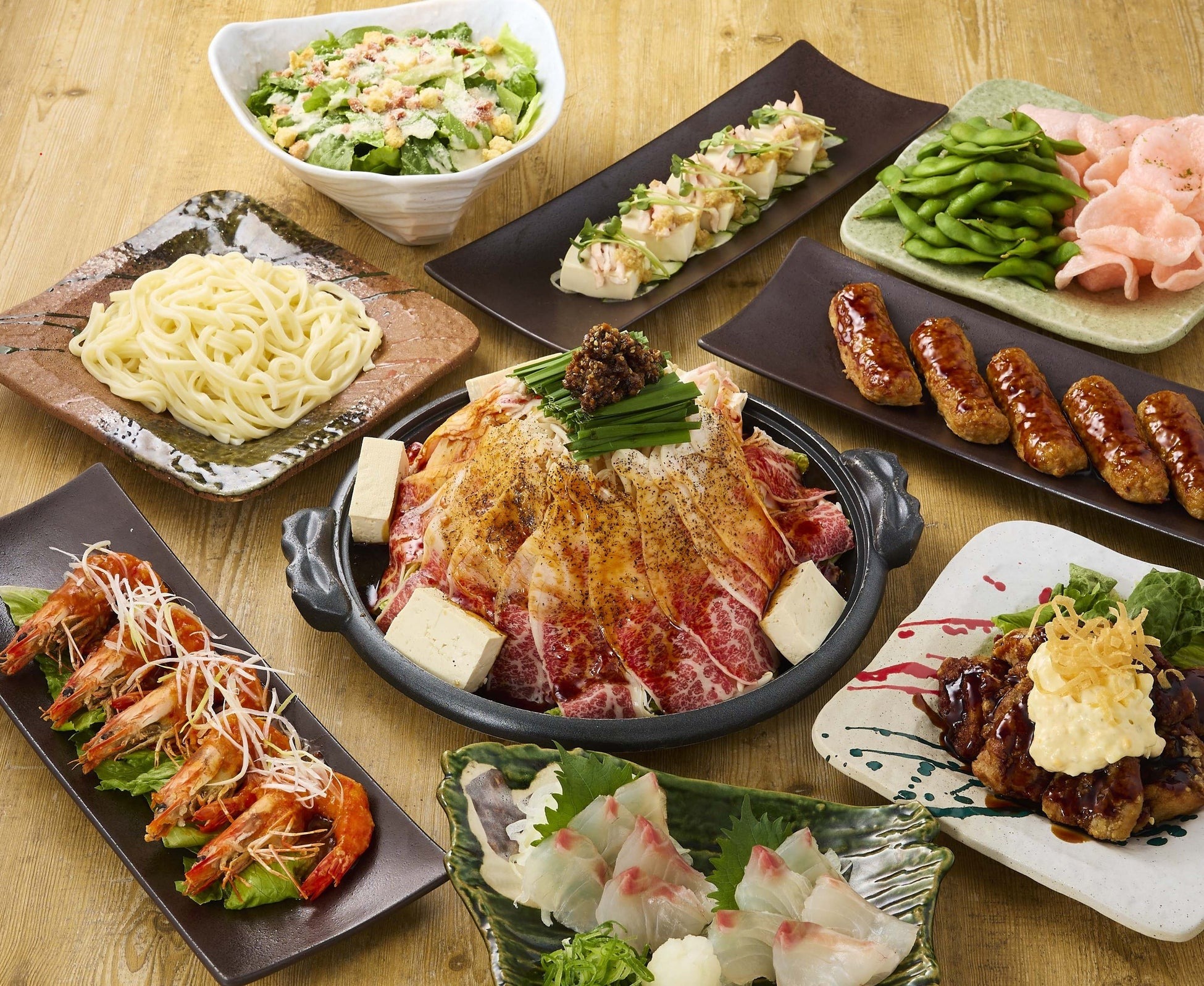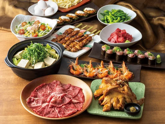 国産黒毛和牛のすき焼き鍋、本マグロのお刺身、もも1本揚げ、ねぎとろのっけ寿司など全10品。