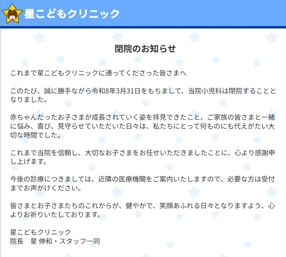 【子育て世帯に衝撃…!】小児科「星こどもクリニック」が3月31日をもって閉院。[厚木市田村町]