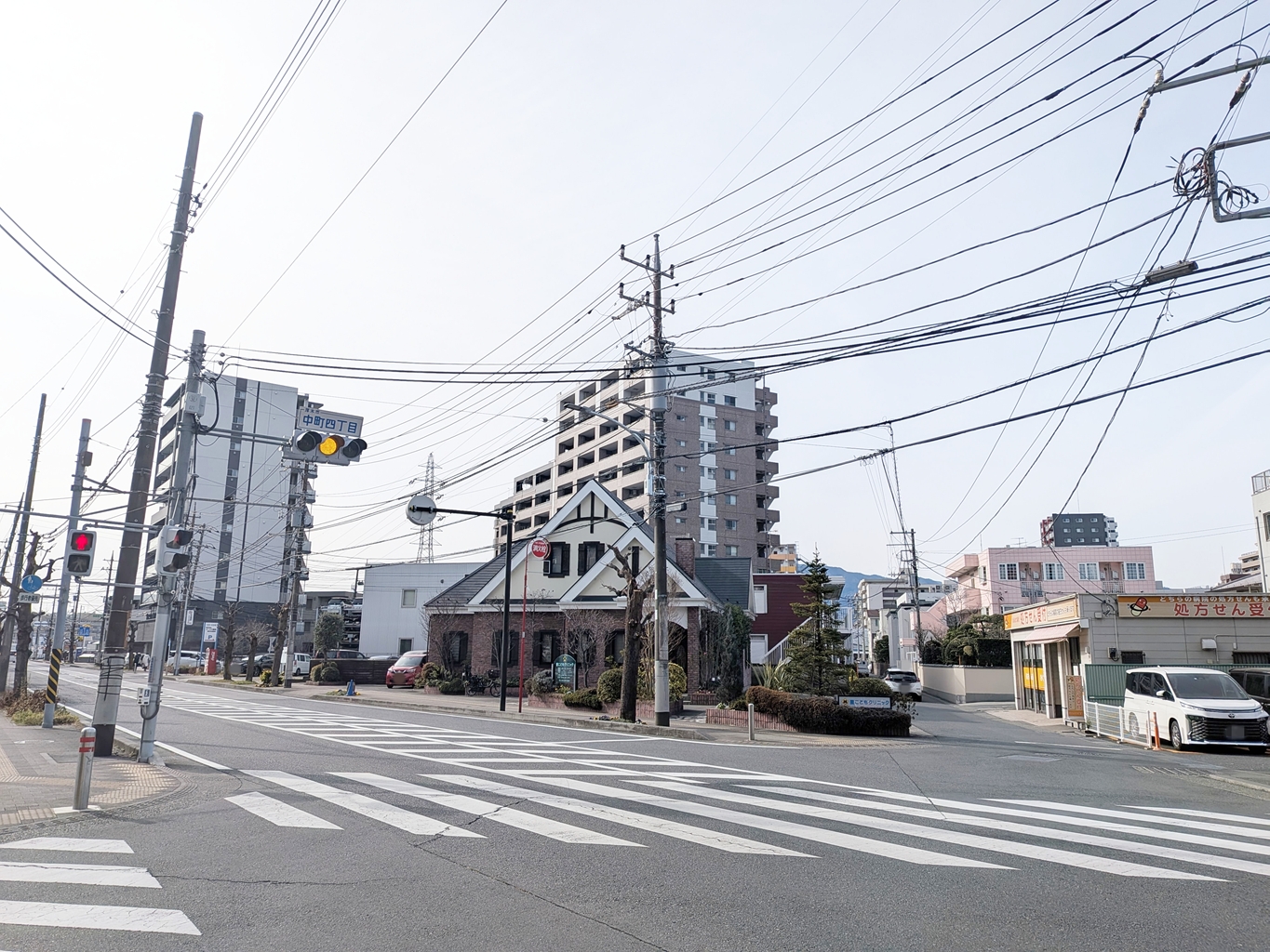「中町四丁目」交差点に面しており、三角屋根が特徴の印象に残る外観です。