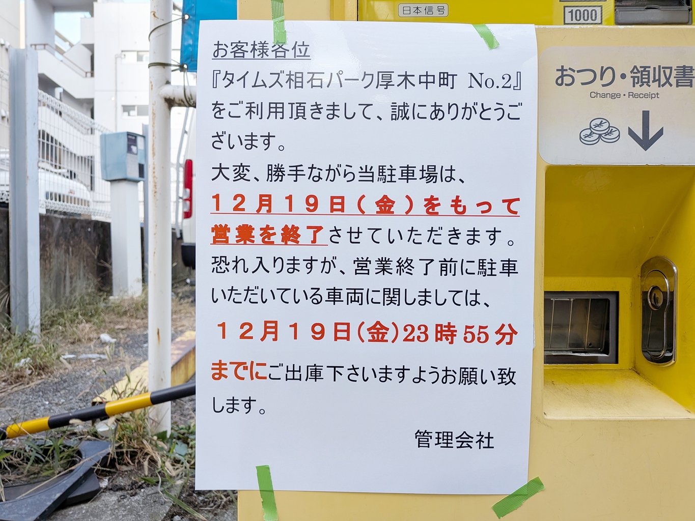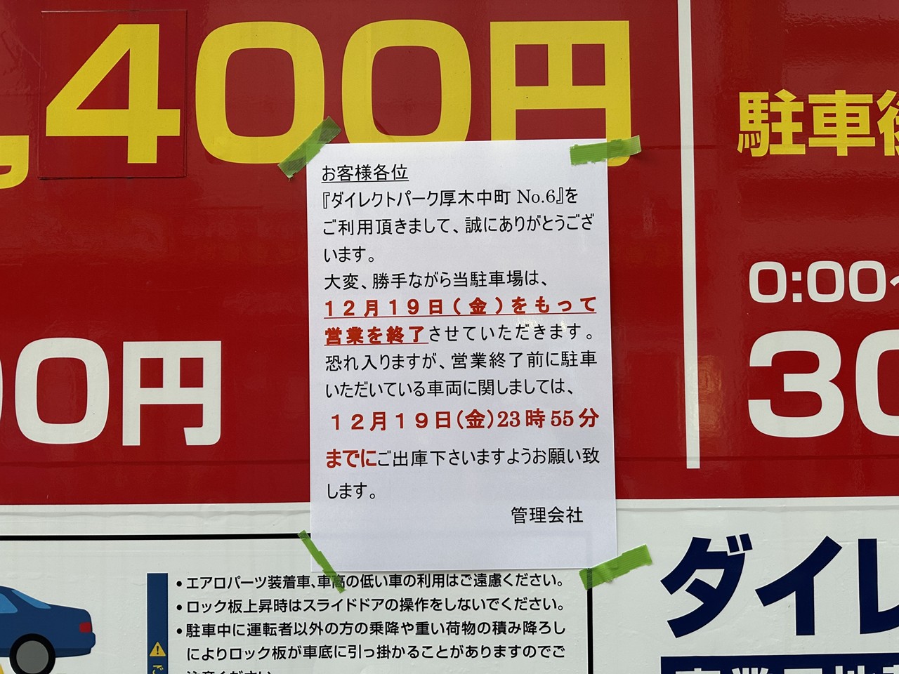 ちなみにお隣のコインパーキング「ダイレクトパーク厚木中町No.6」も、12月19日(金)をもって営業を終了となります。
