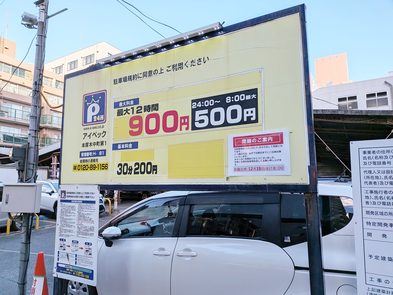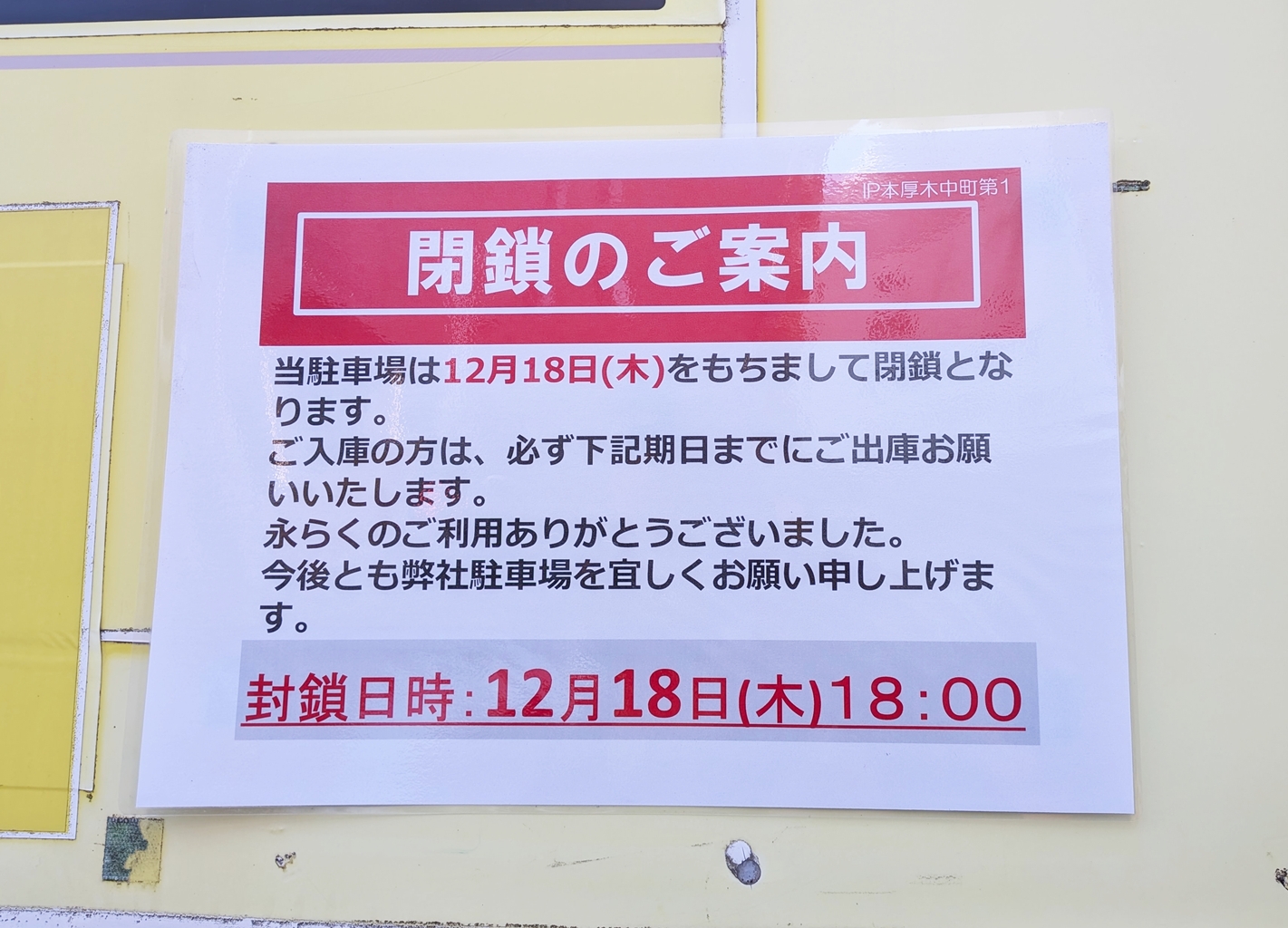 本厚木駅からかなり近い場所のパーキングが閉鎖とは…普段利用されていた方はどうぞご注意ください。