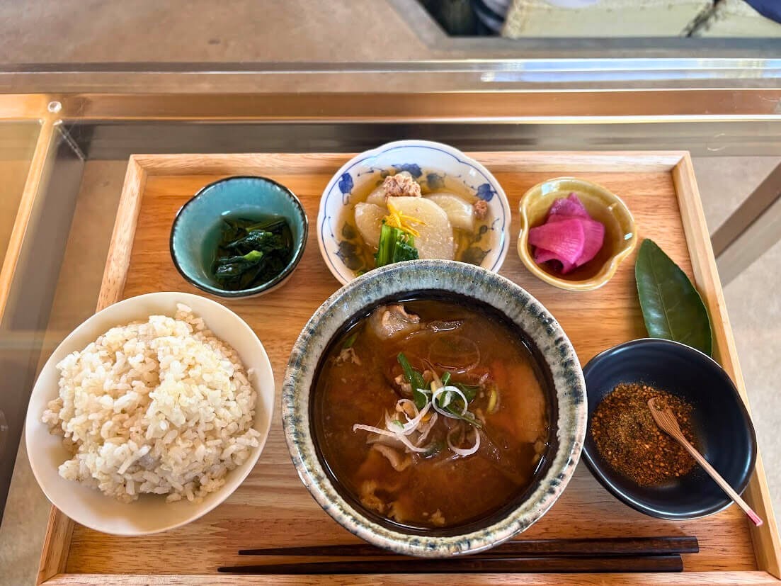 大きな窓から大山やみかん畑を望むロケーションで、地元野菜たっぷりの「一汁三菜ランチ」が楽しめ