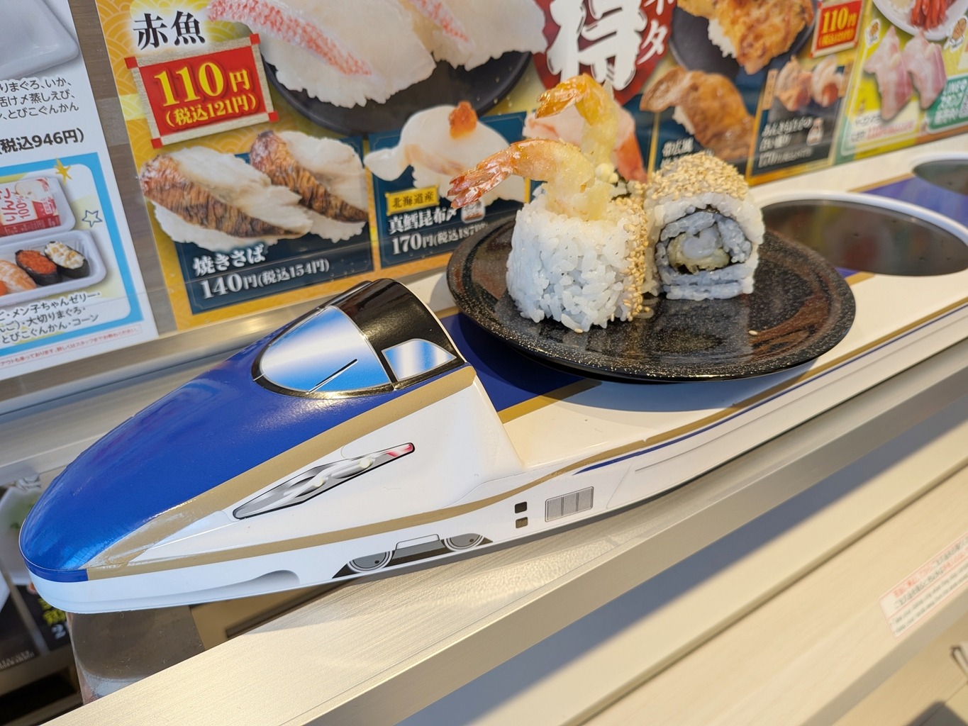 回らないスタイルでお寿司が新幹線で運ばれてくるため、子供のテンションも爆上がり♪