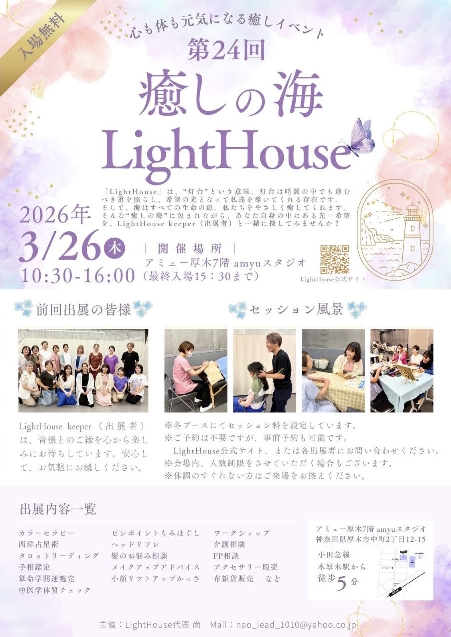【イベント・入場無料】カラーセラピーやもみほぐし等コンテンツいっぱい★「癒しの海 LightHouse」3月26日開催![アミューあつぎ]