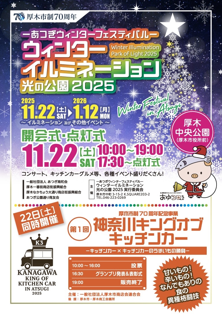 【11月22日から】厚木中央公園で今年もイルミネーションがスタート!開会式当日は「神奈川キングオブキッチンカー」も同時開催♪