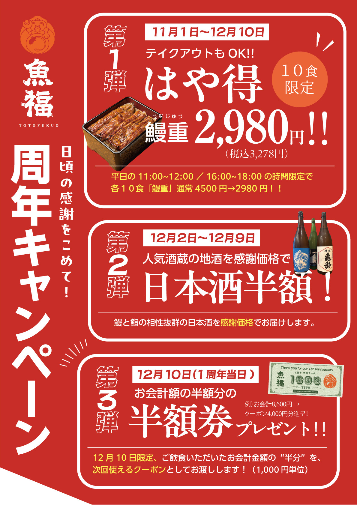 「魚福(ととふく)」の1周年感謝キャンペーン♪