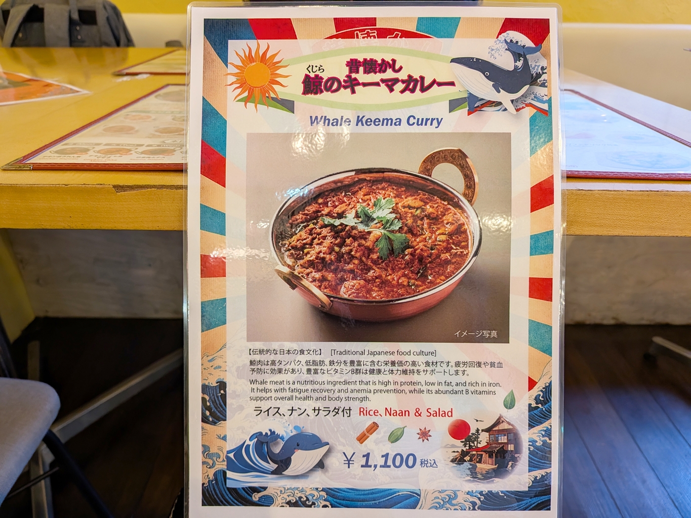 なお、気になった鯨のキーマカレー(1,100円)をタハラ@あつらぼがオーダー。