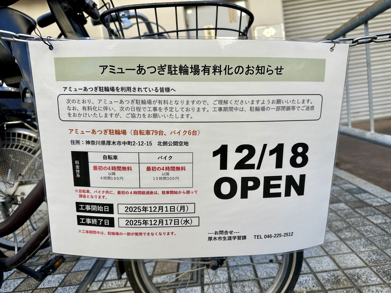 【12月18日開始】アミューあつぎ駐輪場が有料化へ!12月1日〜17日は工事につき利用注意です[厚木市中町]