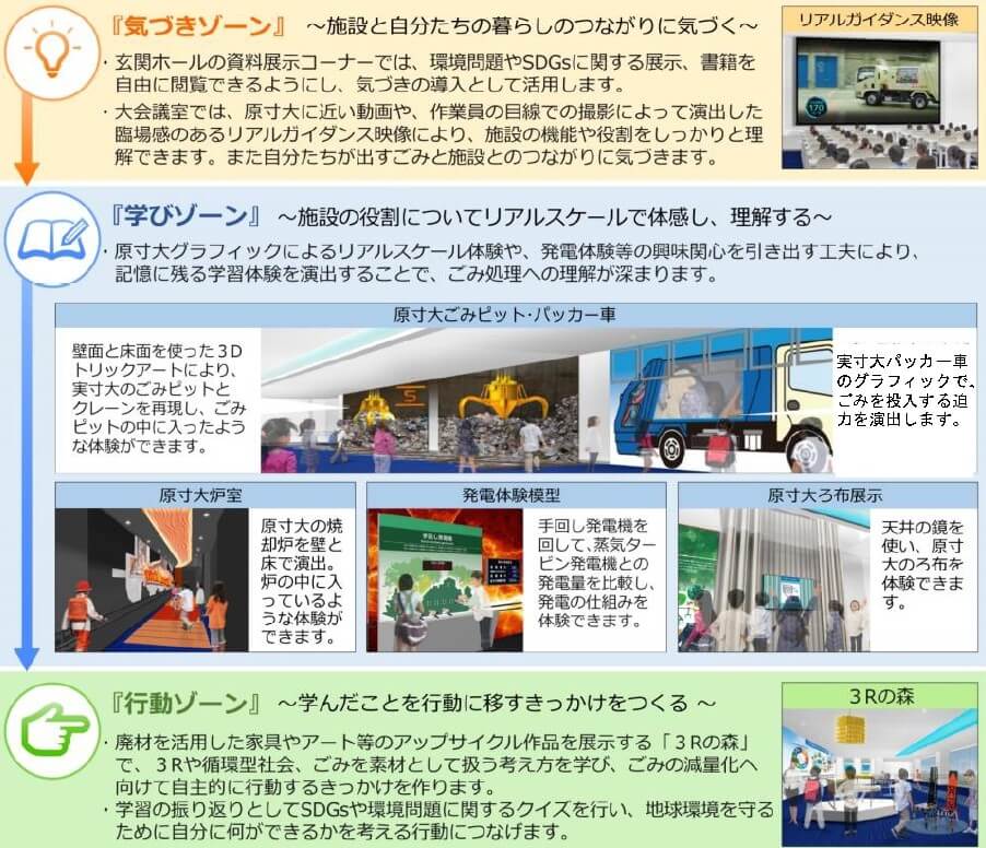 ごみの処理手順によって学習ができる3つのゾーンや、体験・体感型の仕掛けを配置した設備となっているみたい★