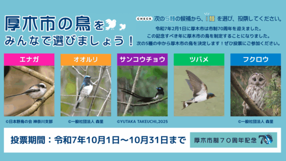 2025.10.08 【投票は10月31日まで】「厚木市の鳥」をみんなで選ぼう!厚木市制70周年記念「市の鳥」制定に向けた市民投票がスタート★