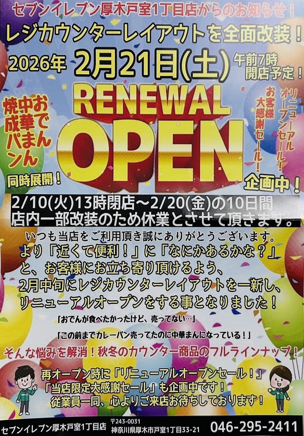 【話題】「セブン-イレブン厚木戸室1丁目店」店内一部改装のため2月10日~20日まで一時休業。2月21日リニューアル★