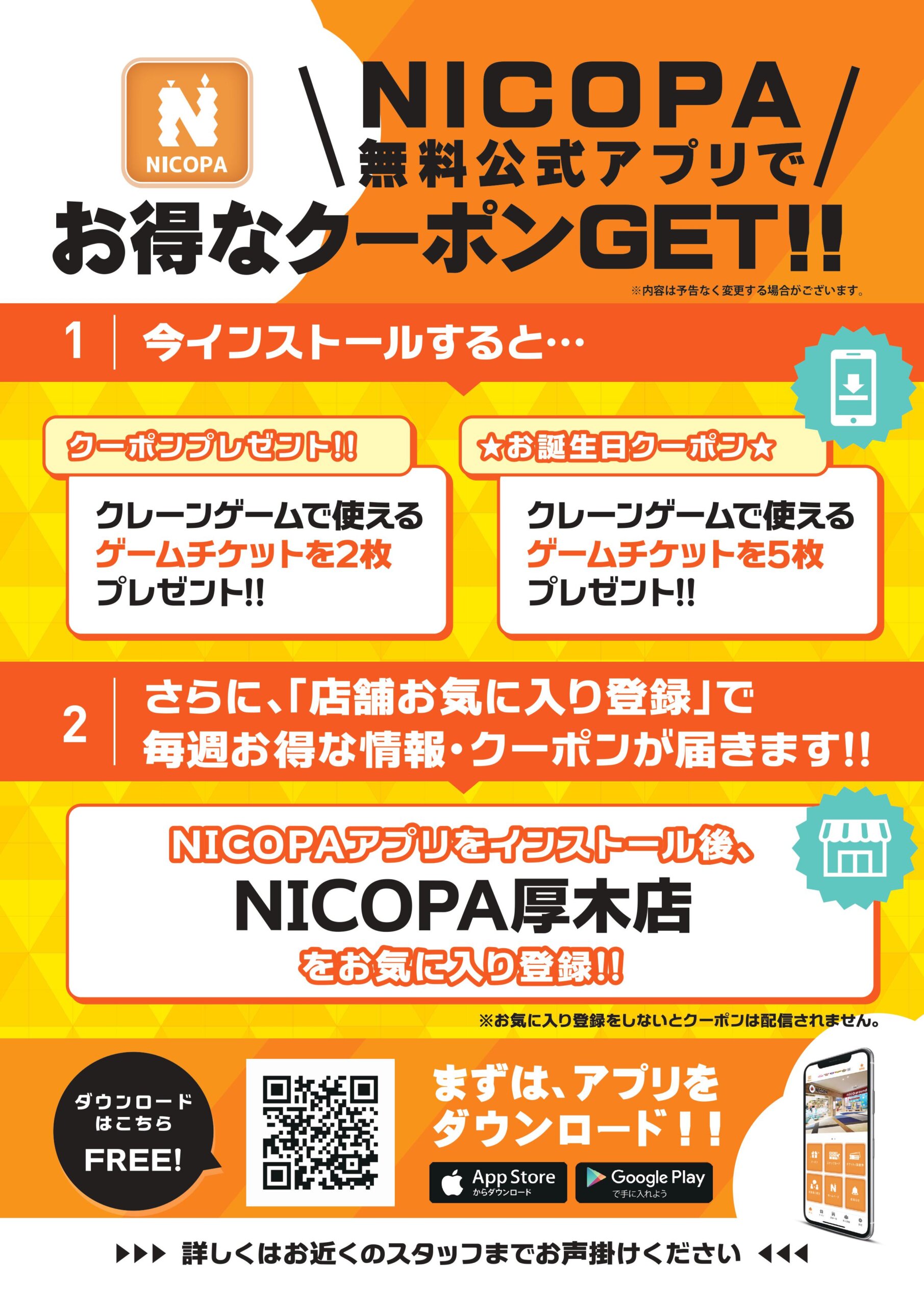 インストール後、「NICOPA厚木店」をお気に入り登録すると、毎週お得な情報・クーポンが届くそう。