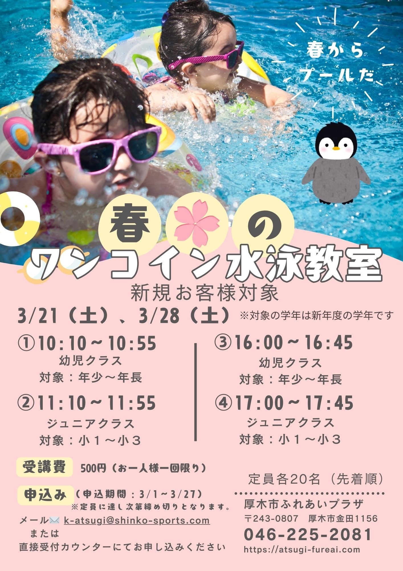 「春のワンコイン水泳教室」3月21日(土)・3月28日(土)【対象:新規の方】