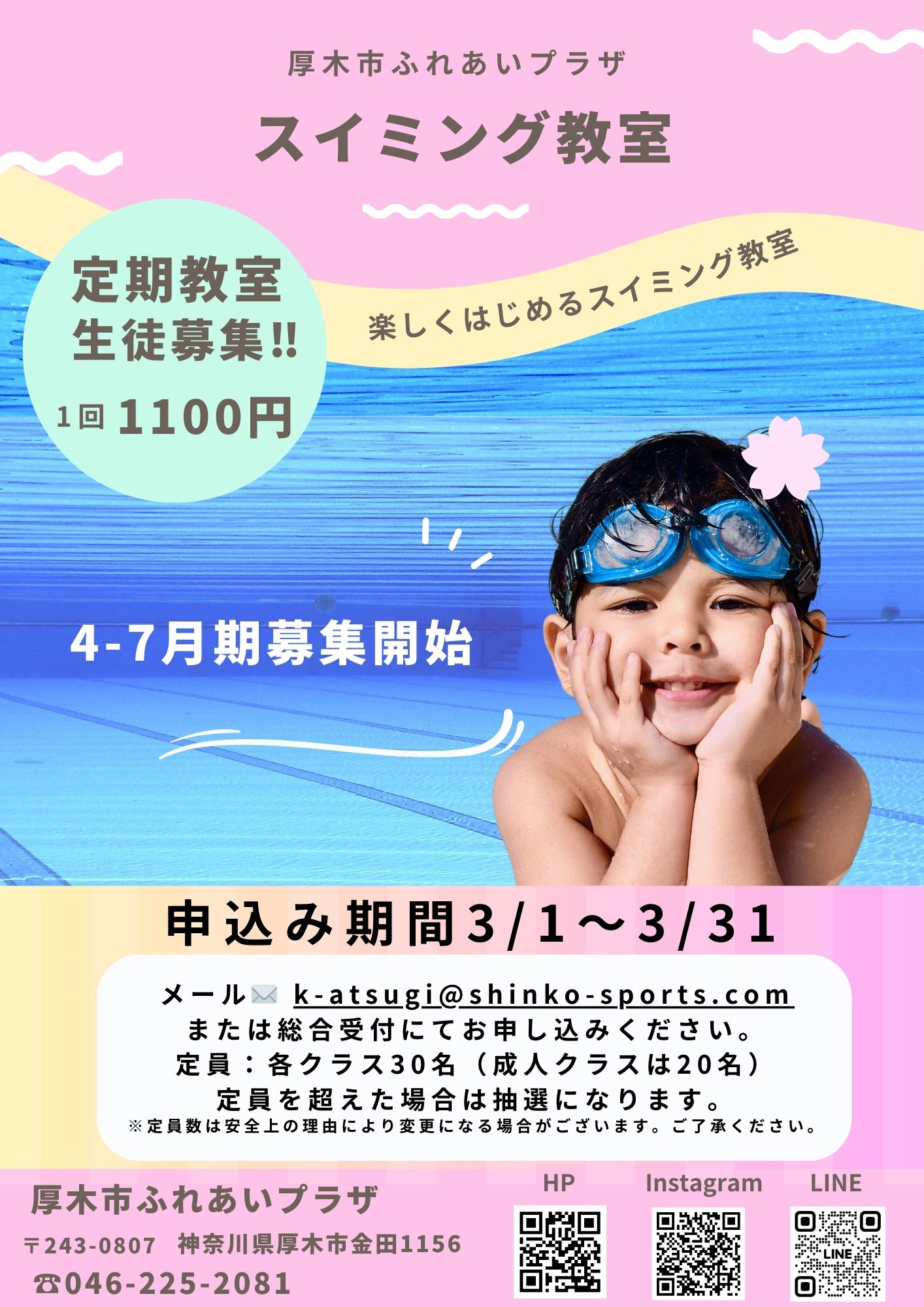 「厚木市ふれあいプラザ スイミング教室」2026年4月~7月期【お申込み期間:3月1日~3月31日】