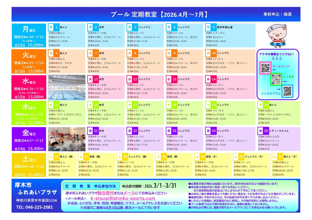 2026年4月~7月に開催されるスイミング教室(定期教室)の、チラシ・スケジュールは以下の通りです。